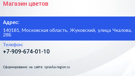 Магазин цветов по адресу 140181, Московская область, Жуковский, улица Чкалова, 28Б в дальнейшем Организация, размещена в следующих категориях: