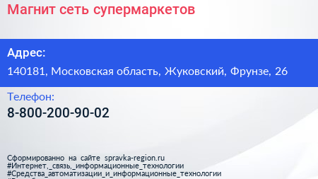 Магнит, сеть супермаркетов по адресу 140181, Московская область, Жуковский, Фрунзе, 26 в дальнейшем Организация, размещена в следующих категориях: