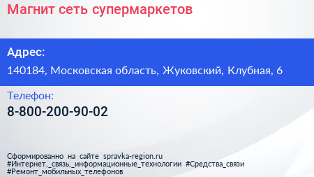 Магнит, сеть супермаркетов по адресу 140184, Московская область, Жуковский, Клубная, 6 в дальнейшем Организация, размещена в следующих категориях: