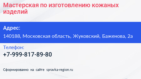Мастерская по изготовлению кожаных изделий по адресу 140188, Московская область, Жуковский, Баженова, 2а в дальнейшем Организация, размещена в следующих категориях: