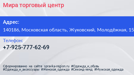 Мира, торговый центр по адресу 140186, Московская область, Жуковский, Молодёжная, 15 в дальнейшем Организация, размещена в следующих категориях: