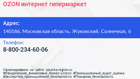 OZON, интернет-гипермаркет по адресу 140186, Московская область, Жуковский, Солнечная, 6 в дальнейшем Организация, размещена в следующих категориях: