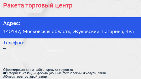 Ракета, торговый центр по адресу 140187, Московская область, Жуковский, Гагарина, 49а в дальнейшем Организация, размещена в следующих категориях: