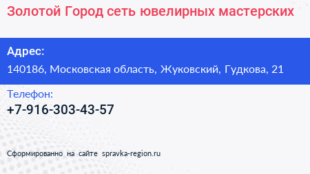 Золотой Город, сеть ювелирных мастерских по адресу 140186, Московская область, Жуковский, Гудкова, 21 в дальнейшем Организация, размещена в следующих категориях: