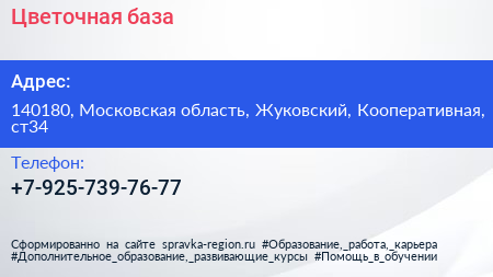 Цветочная база по адресу 140180, Московская область, Жуковский, Кооперативная, ст34 в дальнейшем Организация, размещена в следующих категориях: