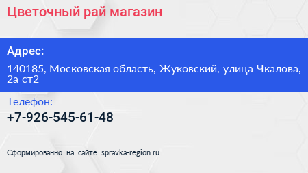 Цветочный рай, магазин по адресу 140185, Московская область, Жуковский, улица Чкалова, 2а ст2 в дальнейшем Организация, размещена в следующих категориях: