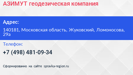 АЗИМУТ, геодезическая компания по адресу 140181, Московская область, Жуковский, Ломоносова, 29а в дальнейшем Организация, размещена в следующих категориях: