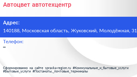 Автоцвет, автотехцентр по адресу 140188, Московская область, Жуковский, Молодёжная, 31 в дальнейшем Организация, размещена в следующих категориях: