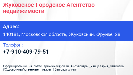 Жуковское Городское Агентство недвижимости по адресу 140181, Московская область, Жуковский, Фрунзе, 28 в дальнейшем Организация, размещена в следующих категориях: