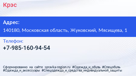 Крэс по адресу 140180, Московская область, Жуковский, Мясищева, 1 в дальнейшем Организация, размещена в следующих категориях:
