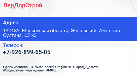 ЛерДорСтрой по адресу 140185, Московская область, Жуковский, Амет-хан Султана, 15 к3 в дальнейшем Организация, размещена в следующих категориях:
