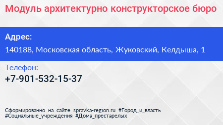 Модуль, архитектурно-конструкторское бюро по адресу 140188, Московская область, Жуковский, Келдыша, 1 в дальнейшем Организация, размещена в следующих категориях: