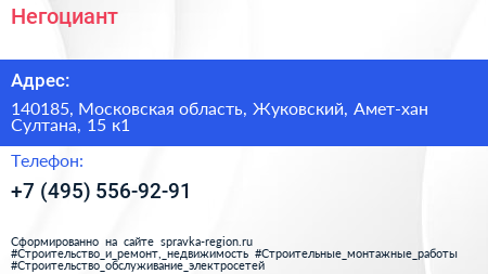 Негоциант по адресу 140185, Московская область, Жуковский, Амет-хан Султана, 15 к1 в дальнейшем Организация, размещена в следующих категориях: