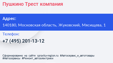 Пушкино Трест, компания по адресу 140180, Московская область, Жуковский, Мясищева, 1 в дальнейшем Организация, размещена в следующих категориях: