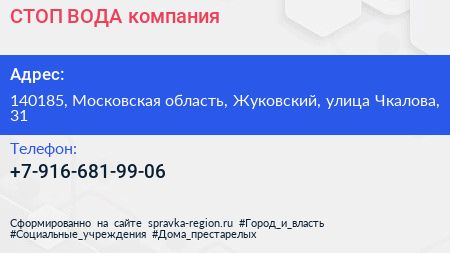 СТОП ВОДА, компания по адресу 140185, Московская область, Жуковский, улица Чкалова, 31 в дальнейшем Организация, размещена в следующих категориях: