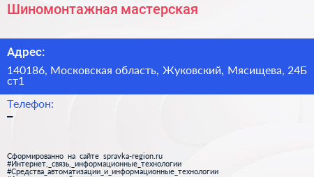 Шиномонтажная мастерская по адресу 140186, Московская область, Жуковский, Мясищева, 24Б ст1 в дальнейшем Организация, размещена в следующих категориях: