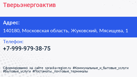 Тверьэнергоактив по адресу 140180, Московская область, Жуковский, Мясищева, 1 в дальнейшем Организация, размещена в следующих категориях: