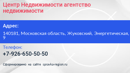 Центр Недвижимости, агентство недвижимости по адресу 140181, Московская область, Жуковский, Энергетическая, 9 в дальнейшем Организация, размещена в следующих категориях: