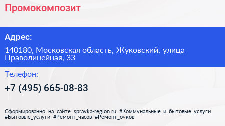 Промокомпозит по адресу 140180, Московская область, Жуковский, улица Праволинейная, 33 в дальнейшем Организация, размещена в следующих категориях: