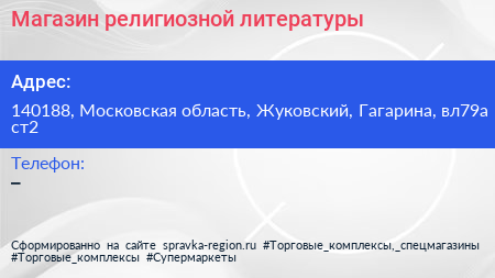Магазин религиозной литературы по адресу 140188, Московская область, Жуковский, Гагарина, вл79а ст2 в дальнейшем Организация, размещена в следующих категориях: