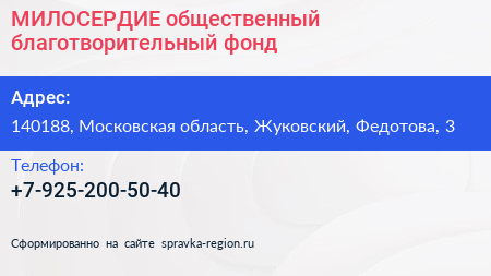 МИЛОСЕРДИЕ, общественный благотворительный фонд по адресу 140188, Московская область, Жуковский, Федотова, 3 в дальнейшем Организация, размещена в следующих категориях: