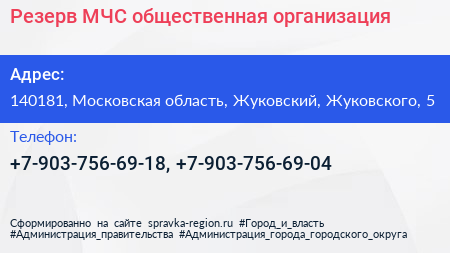 Резерв МЧС, общественная организация по адресу 140181, Московская область, Жуковский, Жуковского, 5 в дальнейшем Организация, размещена в следующих категориях: