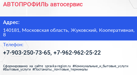 АВТОПРОФИЛЬ, автосервис по адресу 140181, Московская область, Жуковский, Кооперативная, 8 в дальнейшем Организация, размещена в следующих категориях: