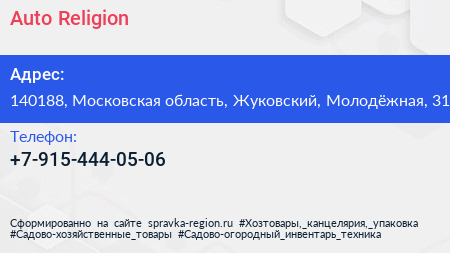 Auto Religion по адресу 140188, Московская область, Жуковский, Молодёжная, 31 в дальнейшем Организация, размещена в следующих категориях:
