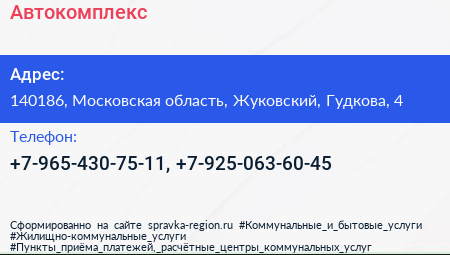 Автокомплекс по адресу 140186, Московская область, Жуковский, Гудкова, 4 в дальнейшем Организация, размещена в следующих категориях: