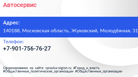 Автосервис по адресу 140188, Московская область, Жуковский, Молодёжная, 31 в дальнейшем Организация, размещена в следующих категориях: