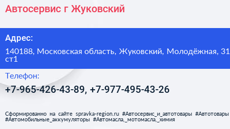 Автосервис, г. Жуковский по адресу 140188, Московская область, Жуковский, Молодёжная, 31 ст1 в дальнейшем Организация, размещена в следующих категориях:
