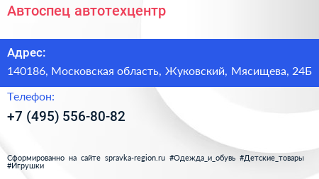 Автоспец, автотехцентр по адресу 140186, Московская область, Жуковский, Мясищева, 24Б в дальнейшем Организация, размещена в следующих категориях: