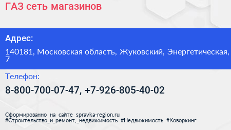 ГАЗ, сеть магазинов по адресу 140181, Московская область, Жуковский, Энергетическая, 7 в дальнейшем Организация, размещена в следующих категориях: