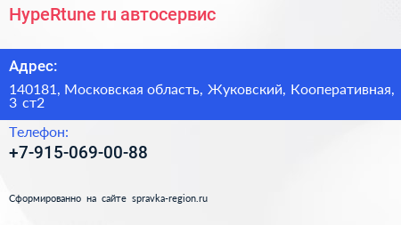 HypeRtune.ru, автосервис по адресу 140181, Московская область, Жуковский, Кооперативная, 3 ст2 в дальнейшем Организация, размещена в следующих категориях: