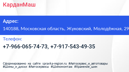 КарданМаш по адресу 140188, Московская область, Жуковский, Молодёжная, 29 в дальнейшем Организация, размещена в следующих категориях: