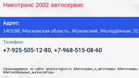 Никотранс-2002, автосервис по адресу 140188, Московская область, Жуковский, Молодёжная, 31 в дальнейшем Организация, размещена в следующих категориях: