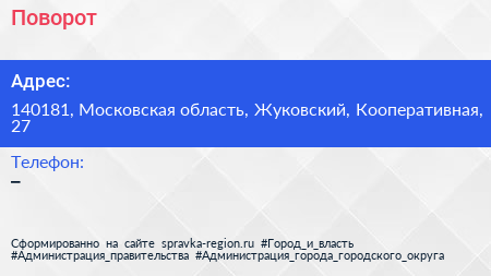 Поворот по адресу 140181, Московская область, Жуковский, Кооперативная, 27 в дальнейшем Организация, размещена в следующих категориях: