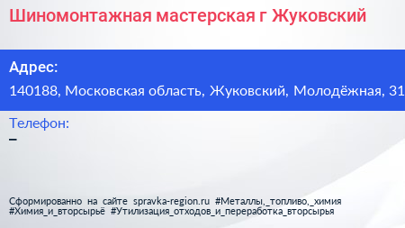 Шиномонтажная мастерская, г. Жуковский по адресу 140188, Московская область, Жуковский, Молодёжная, 31 в дальнейшем Организация, размещена в следующих категориях: