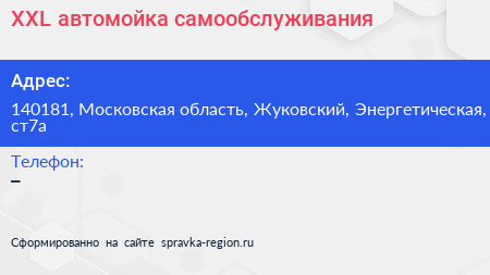 XXL, автомойка самообслуживания по адресу 140181, Московская область, Жуковский, Энергетическая, ст7а в дальнейшем Организация, размещена в следующих категориях:
