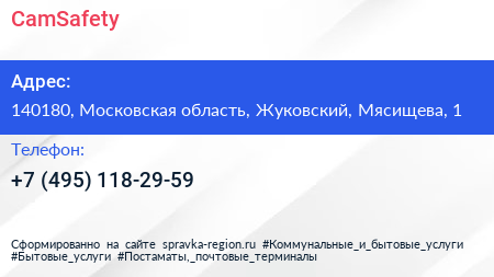 CamSafety по адресу 140180, Московская область, Жуковский, Мясищева, 1 в дальнейшем Организация, размещена в следующих категориях: