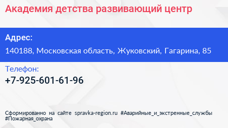 Академия детства, развивающий центр по адресу 140188, Московская область, Жуковский, Гагарина, 85 в дальнейшем Организация, размещена в следующих категориях: