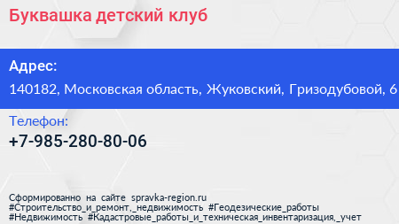 Буквашка, детский клуб по адресу 140182, Московская область, Жуковский, Гризодубовой, 6 в дальнейшем Организация, размещена в следующих категориях: