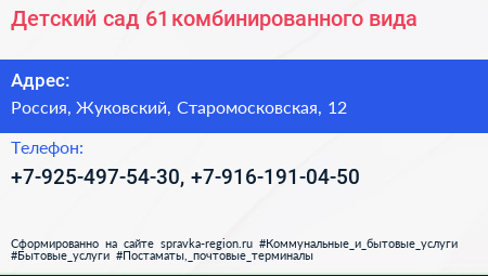 Детский сад №61 комбинированного вида по адресу 12, Старомосковская улица, ДНТ НИР "Отдых", ДСК Красный Бор, Кратово, Раменский городской округ, Московская область, Центральный федеральный округ, 140130, Россия в дальнейшем Организация, размещена в следующих категориях: