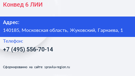 Конвед-6 ЛИИ по адресу 140185, Московская область, Жуковский, Гарнаева, 1 в дальнейшем Организация, размещена в следующих категориях: