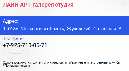 ЛАЙН АРТ, галерея-студия по адресу 140186, Московская область, Жуковский, Солнечная, 9 в дальнейшем Организация, размещена в следующих категориях: