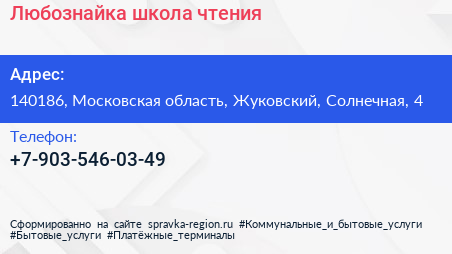 Любознайка, школа чтения по адресу 140186, Московская область, Жуковский, Солнечная, 4 в дальнейшем Организация, размещена в следующих категориях: