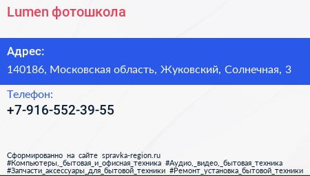 Lumen, фотошкола по адресу 140186, Московская область, Жуковский, Солнечная, 3 в дальнейшем Организация, размещена в следующих категориях: