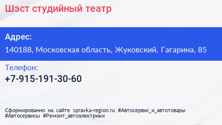 Шэст, студийный театр по адресу 140188, Московская область, Жуковский, Гагарина, 85 в дальнейшем Организация, размещена в следующих категориях: