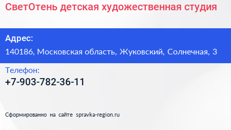 СветОтень, детская художественная студия по адресу 140186, Московская область, Жуковский, Солнечная, 3 в дальнейшем Организация, размещена в следующих категориях: