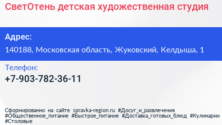 СветОтень, детская художественная студия по адресу 140188, Московская область, Жуковский, Келдыша, 1 в дальнейшем Организация, размещена в следующих категориях: